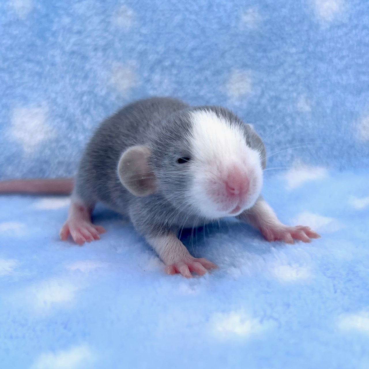 Sex: Male Color: Russian Blue Markings: Blazed Berkshire Fur: Standard Ears: Dumbo Eyes: Black Tail: Standard Size: Standard