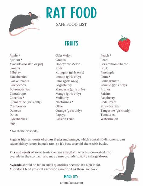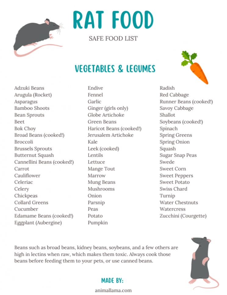 Rats also need fresh fruits and vegetables but be careful not to give toxic ones. Hereis some info from Animallama on what to feed and what not to feed. Also, limit watery ones to just a little bit so they don't get diarrhea.