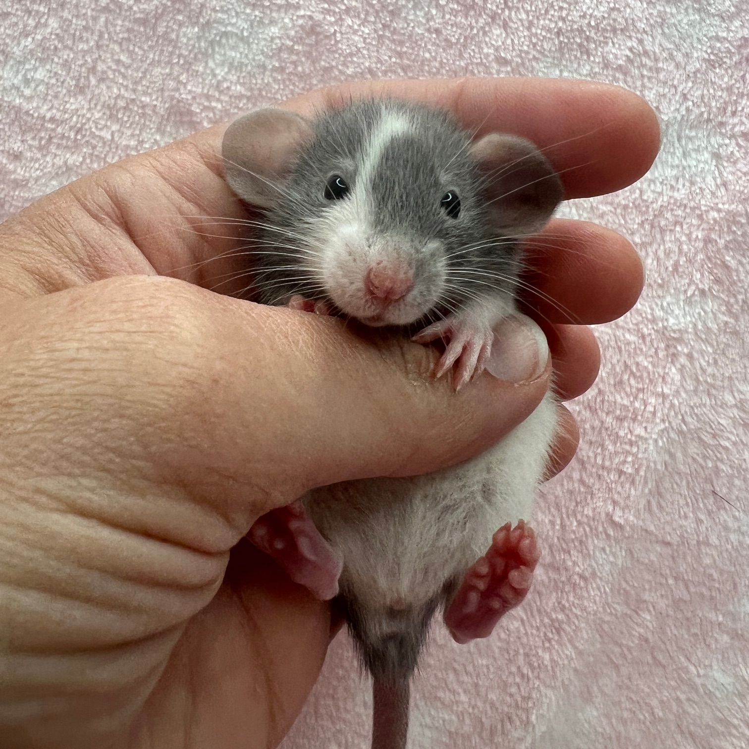 Sex: Female Color: Russian Blue Markings: Lightning Blazed Berkshire Fur: Standard Ears: Dumbo Eyes: Black Tail: Standard Size: Standard