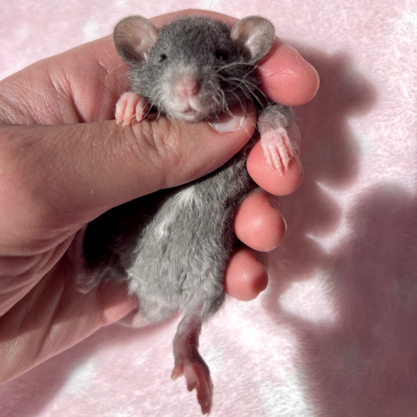 Sex: Female Color: Russian Blue Markings: Berkshire Fur: Rex Ears: Dumbo Eyes: Black Tail: Standard Size: Standard