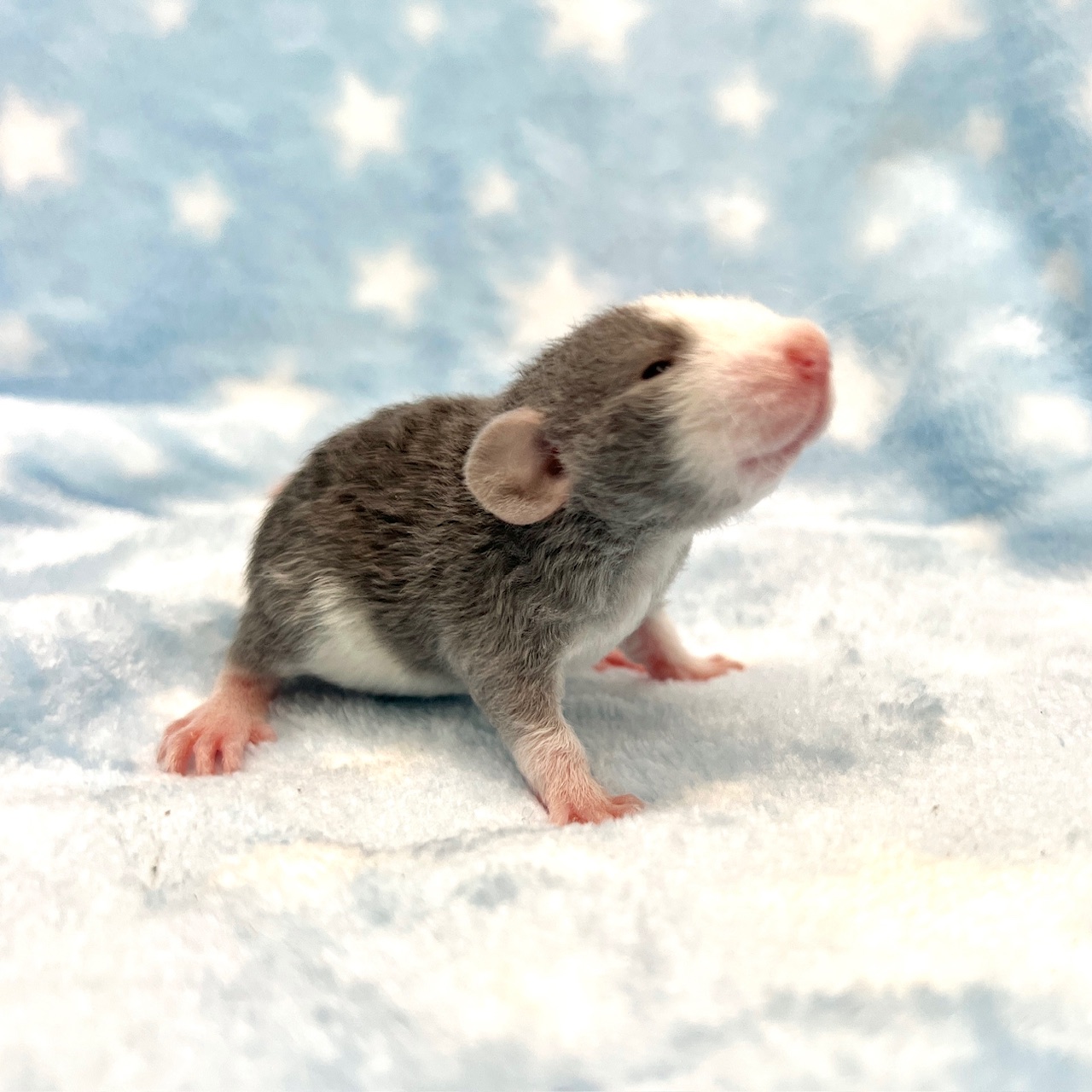 Sex: Male Color: Russian Blue Markings: Blazed Berkshire Fur: Rex Ears: Dumbo Eyes: Black Tail: Standard Size: Standard