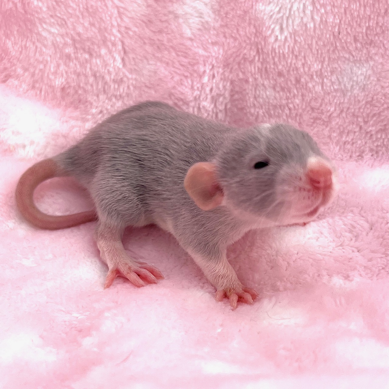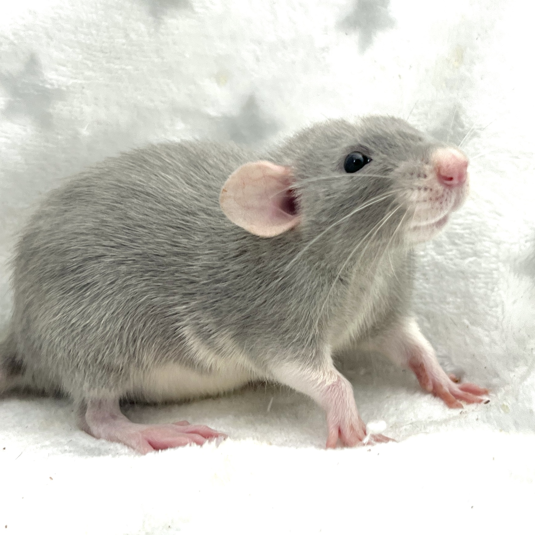 Sex: Female Color: American Blue Markings: Headspot Berkshire Fur: Standard Ears: Dumbo Eyes: Black Tail: Standard Size: Standard