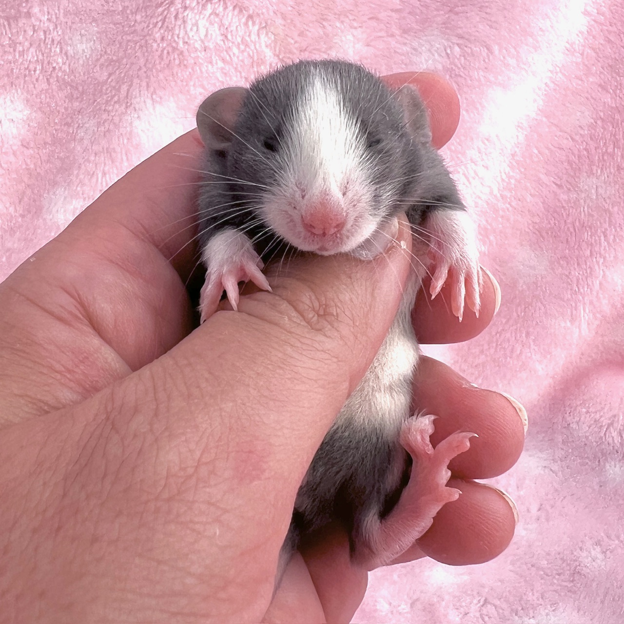 Sex: Female Color: Black Markings: Badger Blazed Berkshire Fur: Silvermane Ears: Dumbo Eyes: Black Tail: Standard Size: Standard