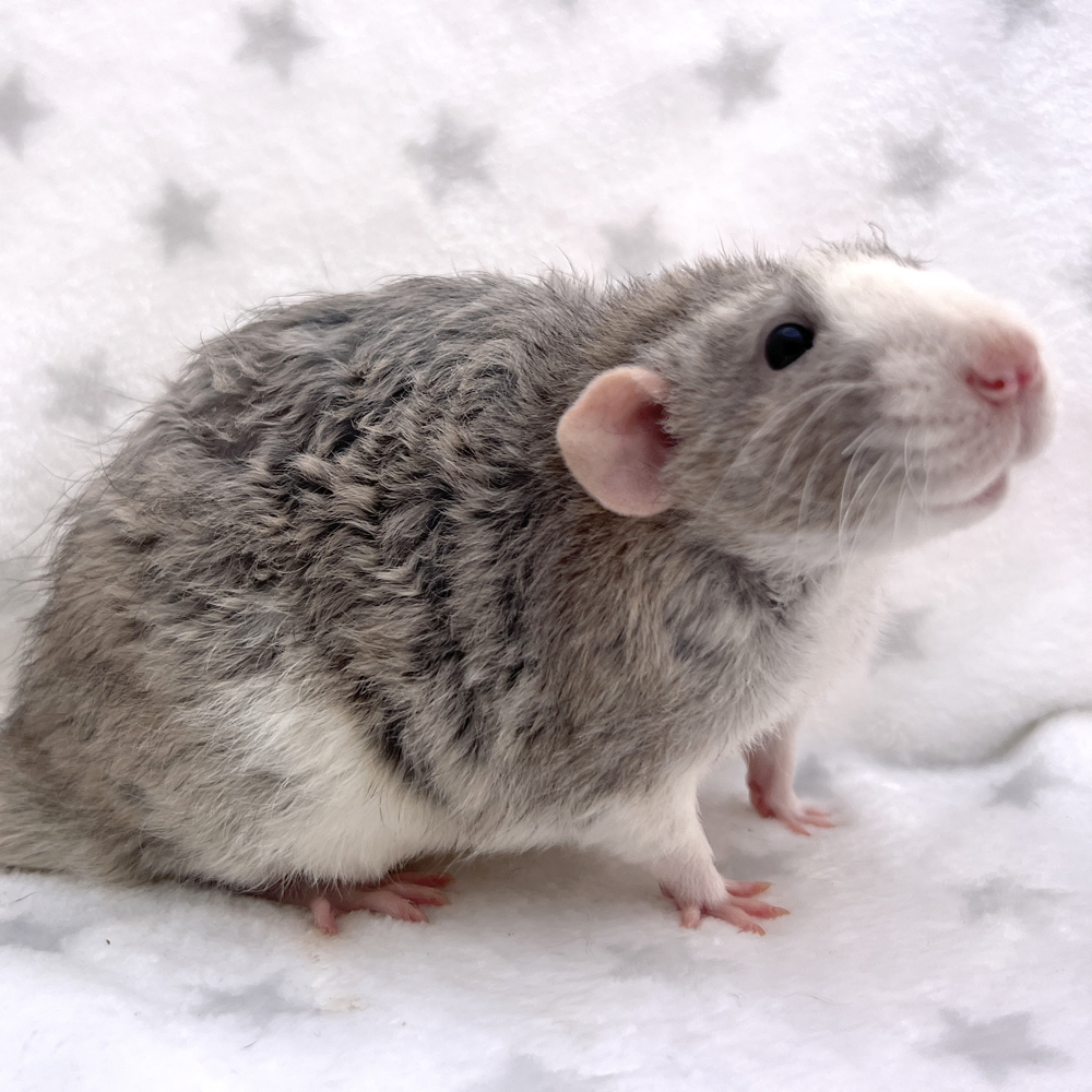 Sex: Male Color: Russian Blue Agouti Markings: Blazed Berkshire Fur: Rex Ears: Dumbo Eyes: Black Tail: Standard Size: Standard
