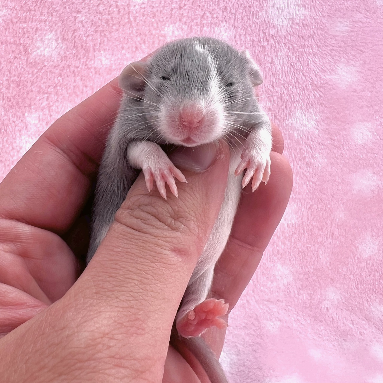 Sex: Female Color: Russian Blue Markings: Lightning Blaze Berkshire Fur: Standard Ears: Dumbo Eyes: Black Tail: Standard Size: Standard