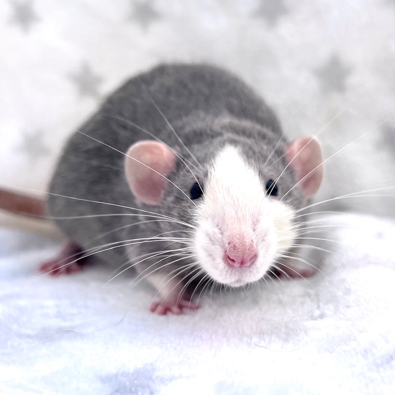 Sex: Male Color: Russian Blue Markings: Blazed Berkshire Fur: Standard Ears: Dumbo Eyes: Black Tail: Standard Size: Standard