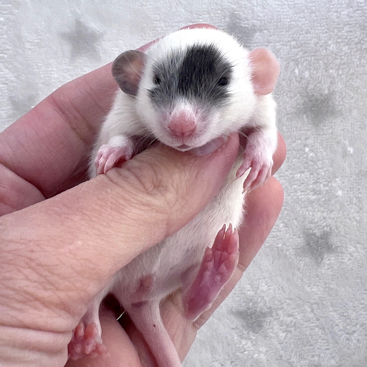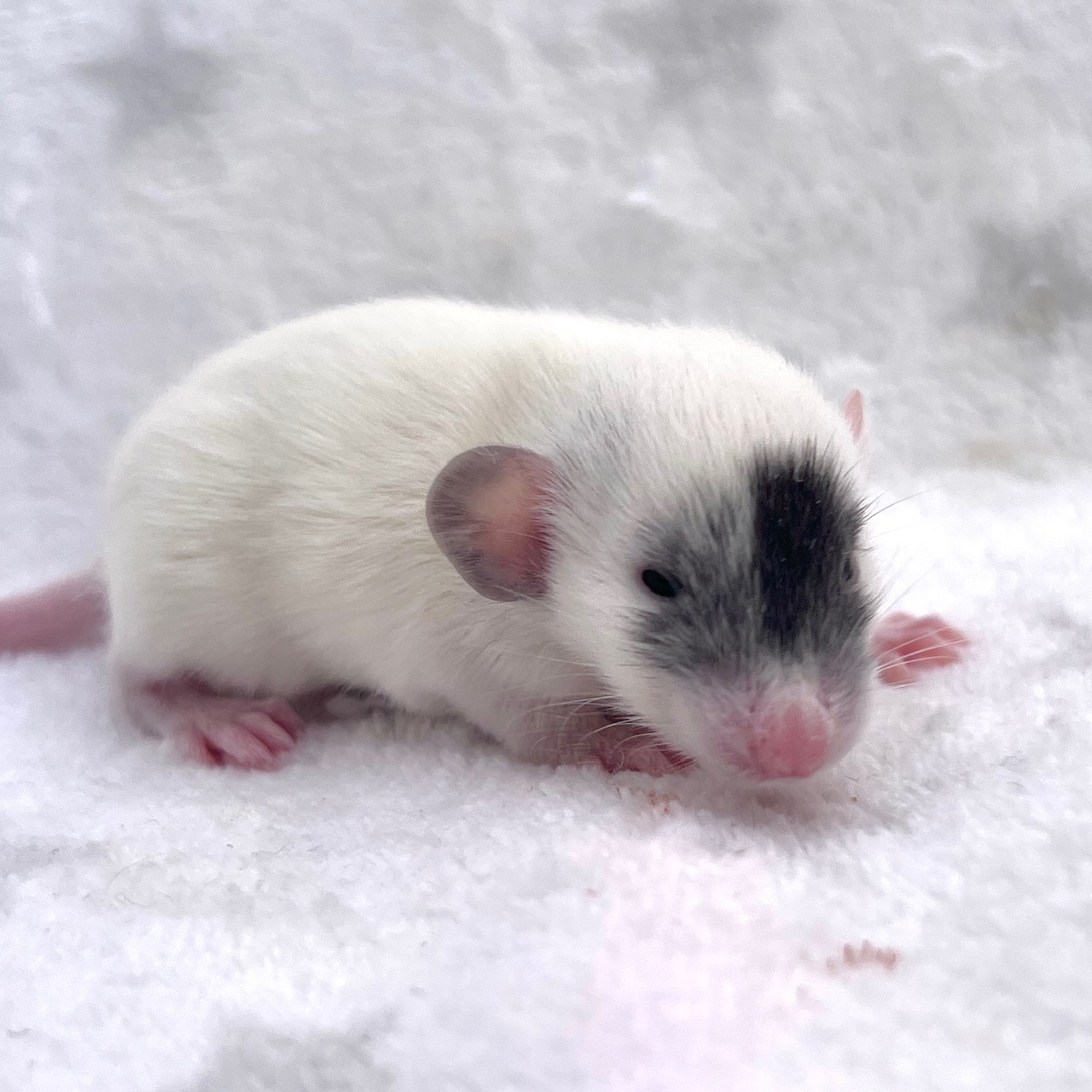Sex: Female Color: Black Markings: Dalmation Masked Fur: Standard Ears: Dumbo Eyes: Black Tail: Standard Size: Standard