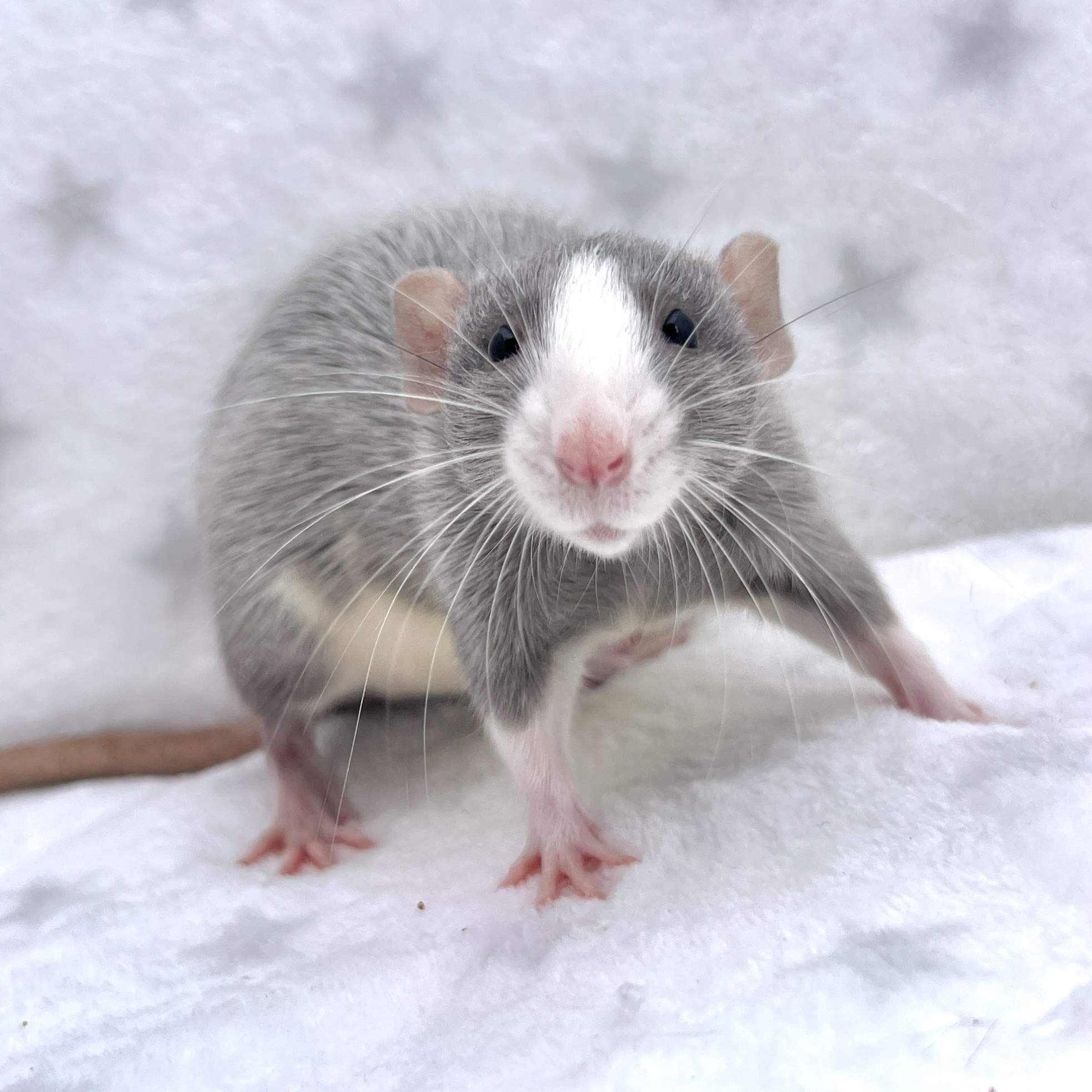 Sex: Female Color: Black Markings: Badger Blazed Berkshire Fur: Silvermane Ears: Dumbo Eyes: Black Tail: Standard Size: Standard