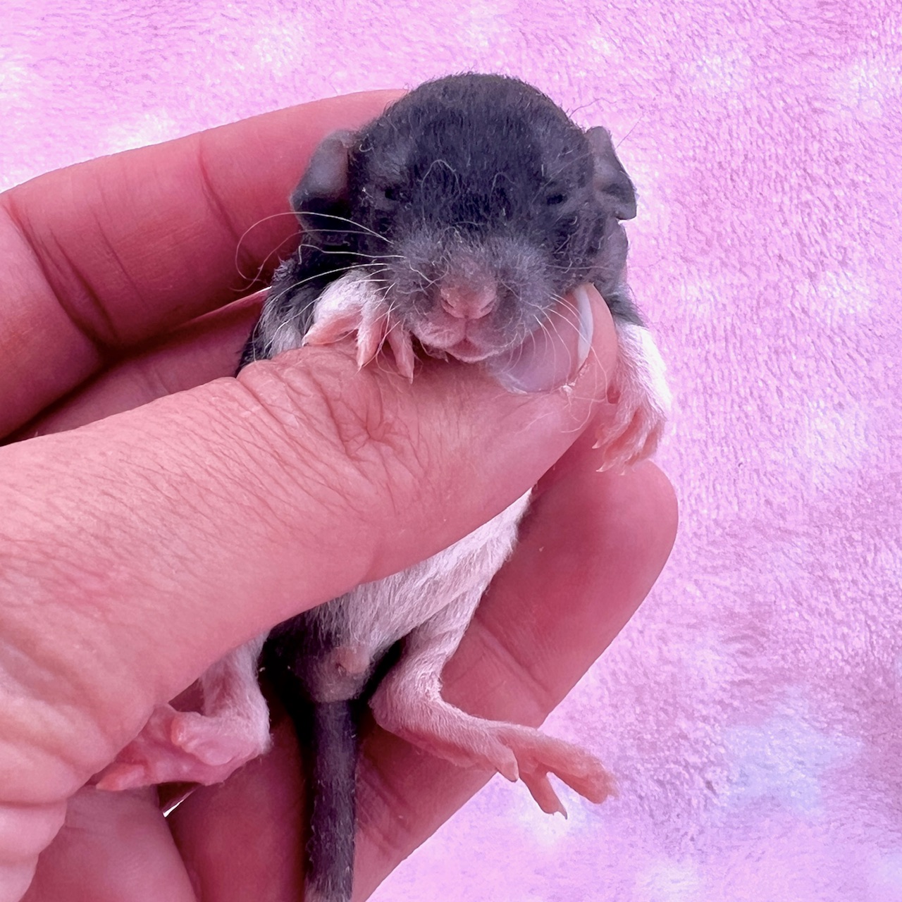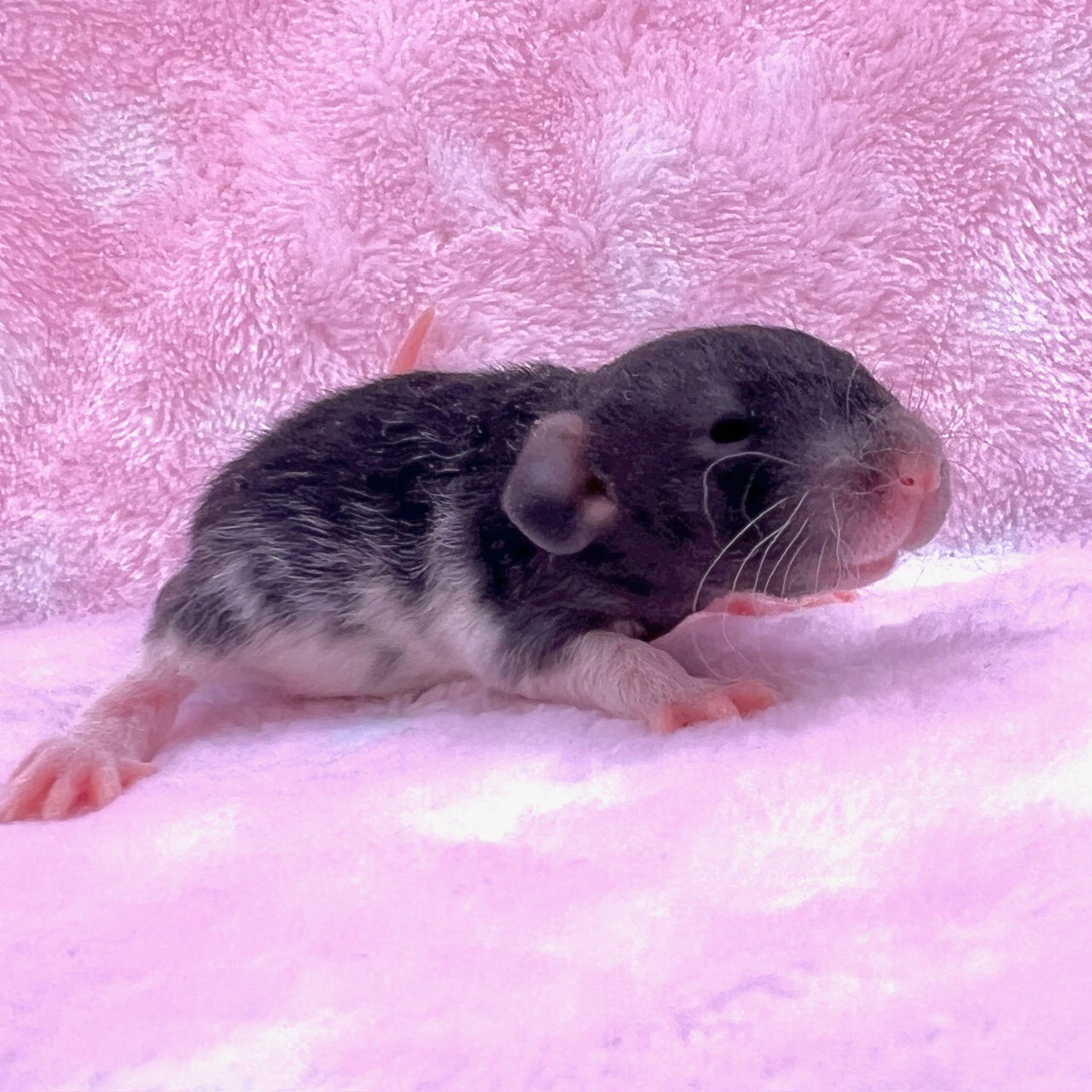 Sex: Female Color: Black Markings: Variberk Fur: Rex Ears: Dumbo Eyes: Black Tail: Standard Size: Standard