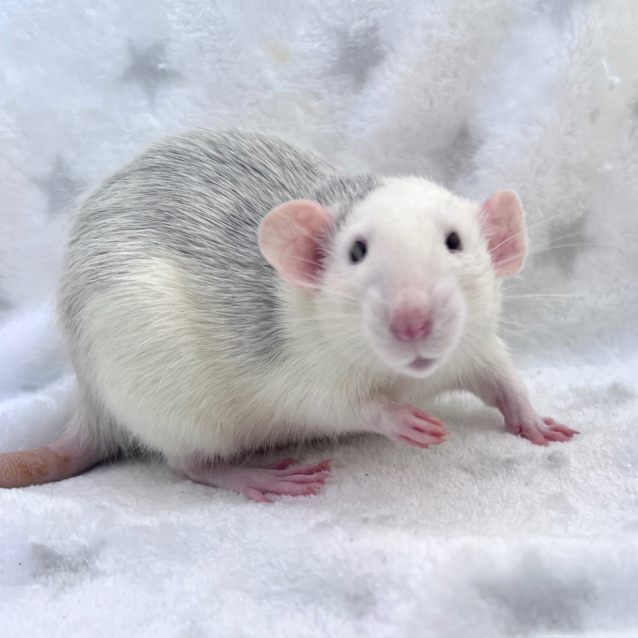 Sex: Female Color: Russian Blue Roan Markings: Possum Hooded Fur: Standard Ears: Dumbo Eyes: Black Tail: Standard Size: Standard