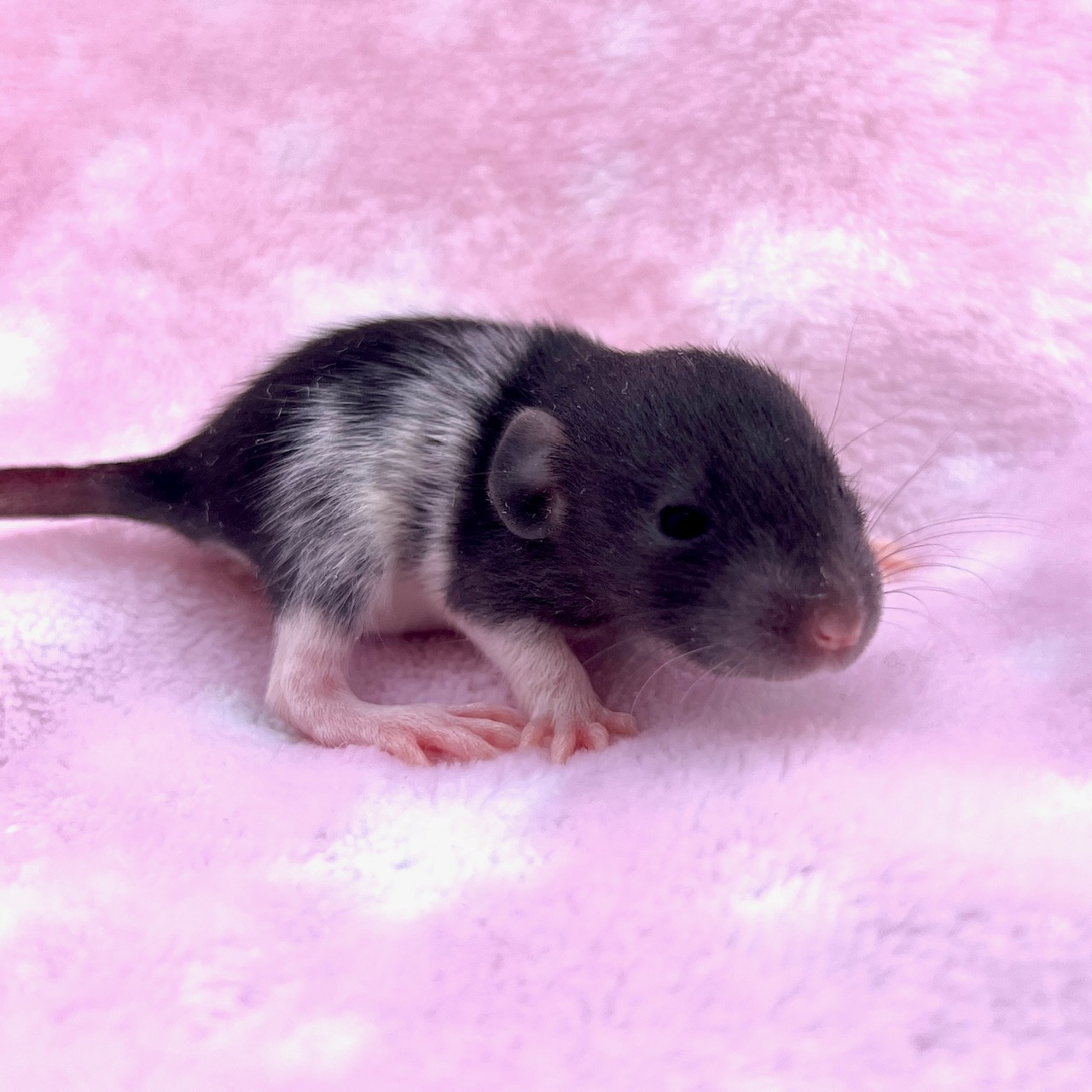 Sex: Female Color: Black Markings: Hooded Fur: Standard Ears: Dumbo Eyes: Black Tail: Standard Size: Standard
