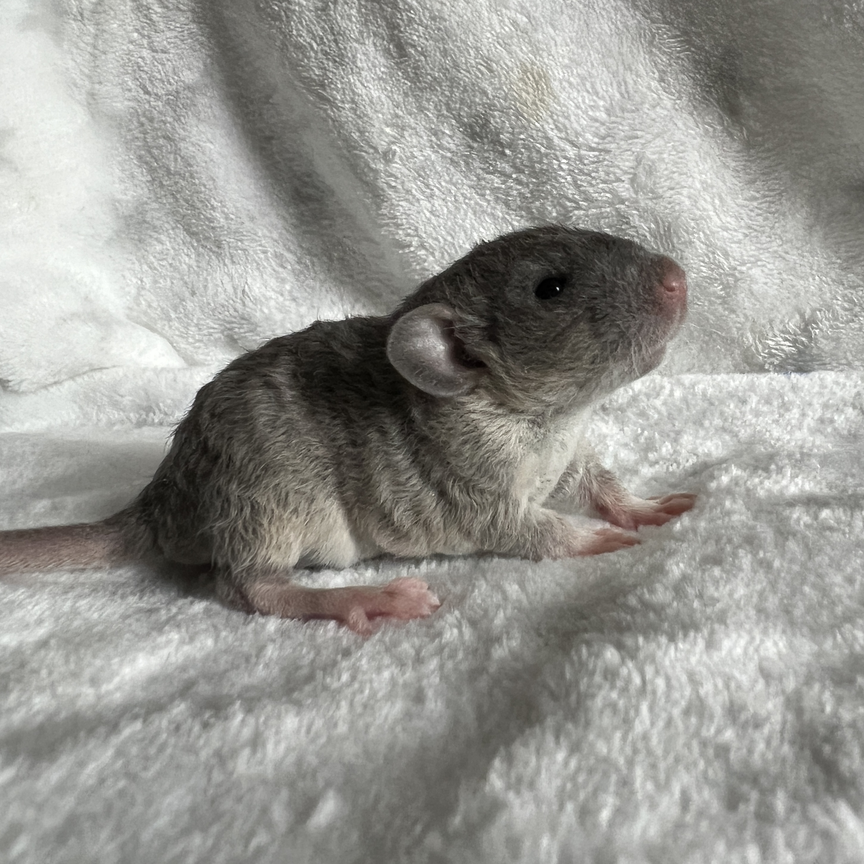 Sex: Female Color: Russian Blue Agouti Markings: Self Fur: Rex Ears: Dumbo Eyes: Black Tail: Standard Size: Standard