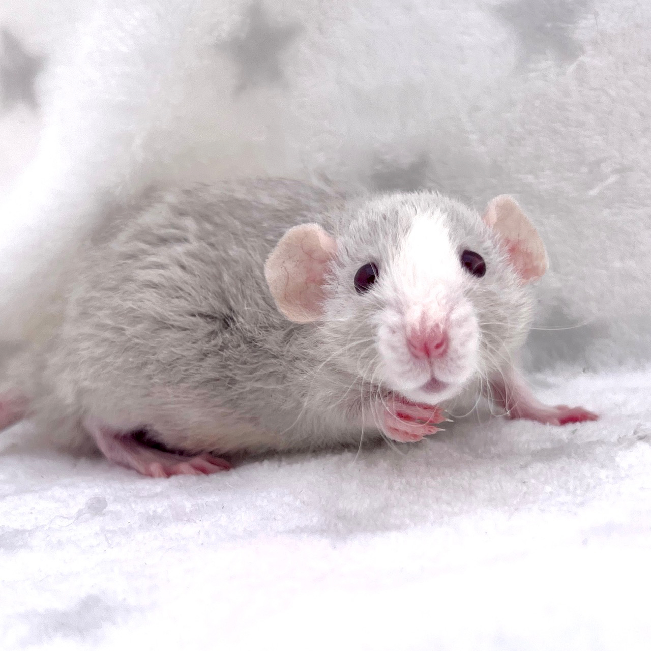 Sex: Male Color: Beige Markings: Blazed Berkshire Fur: Rex Ears: Dumbo Eyes: Ruby Tail: Standard Size: Dwarf