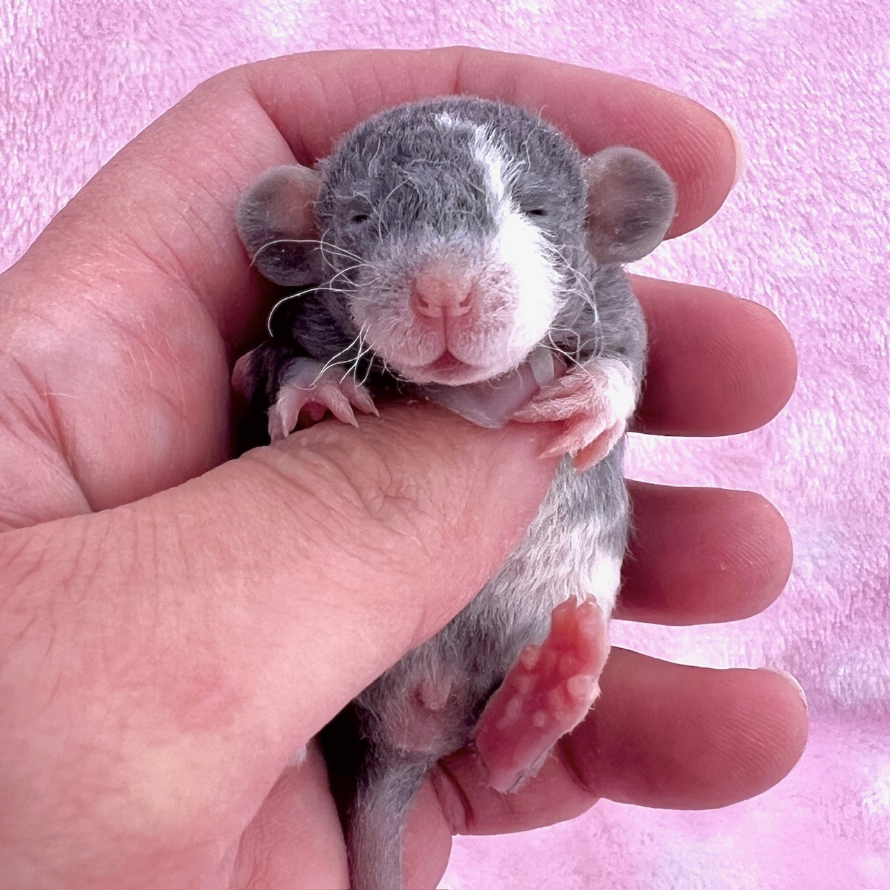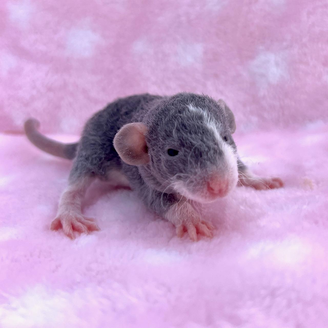 Sex: Female Color: Russian Blue Markings: Lightning Blazed Berkshire Fur: Drex Ears: Dumbo Eyes: Black Tail: Standard Size: Standard