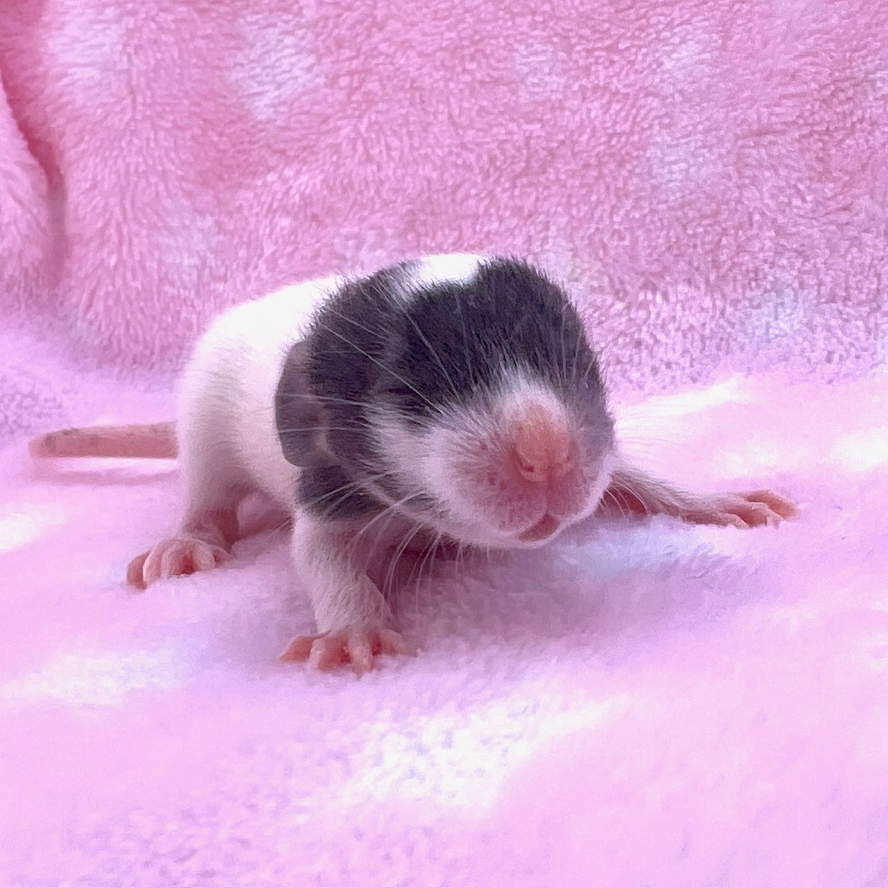 Sex: Female Color: Black Markings: Headspot Capped Fur: Standard Ears: Dumbo Eyes: Black Tail: Standard Size: Standard